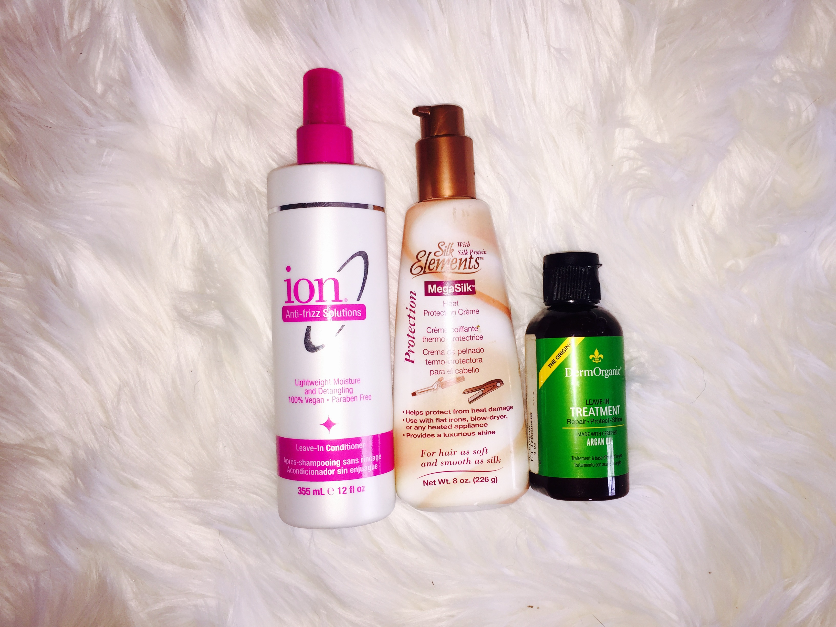 After the shower I comb my hair out (with a comb people, not a brush), and then use the moisture/detangling spray. After about ten minutes, I make a mixture with about one full pump of the silk elements and then enough of the dermorganic to cover the silk elements. Silk Elements is a heat protecting cream, and Dermorganic is made with argan oil to repair, protect, and shine. I find all of these three products at Sally’s as well.