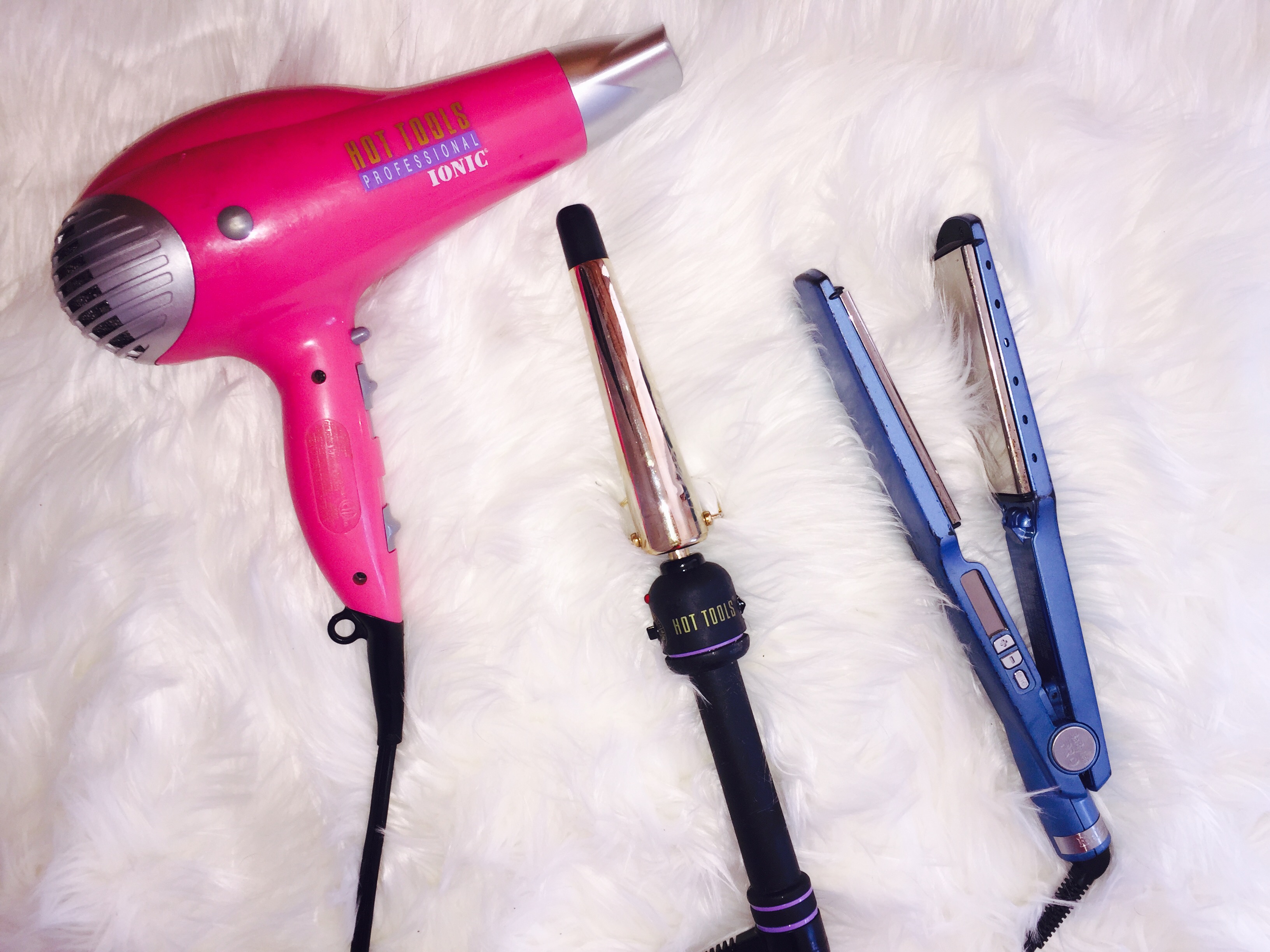 I then blow dry my hair (a hot tools hair dryer that I have had since high school and still works like a champ), and then either curl (aka wand because I’m not a real girl and can’t use a real curling iron), or straighten my hair. My hair stylist told me to always buy gold plated hair styling accessories