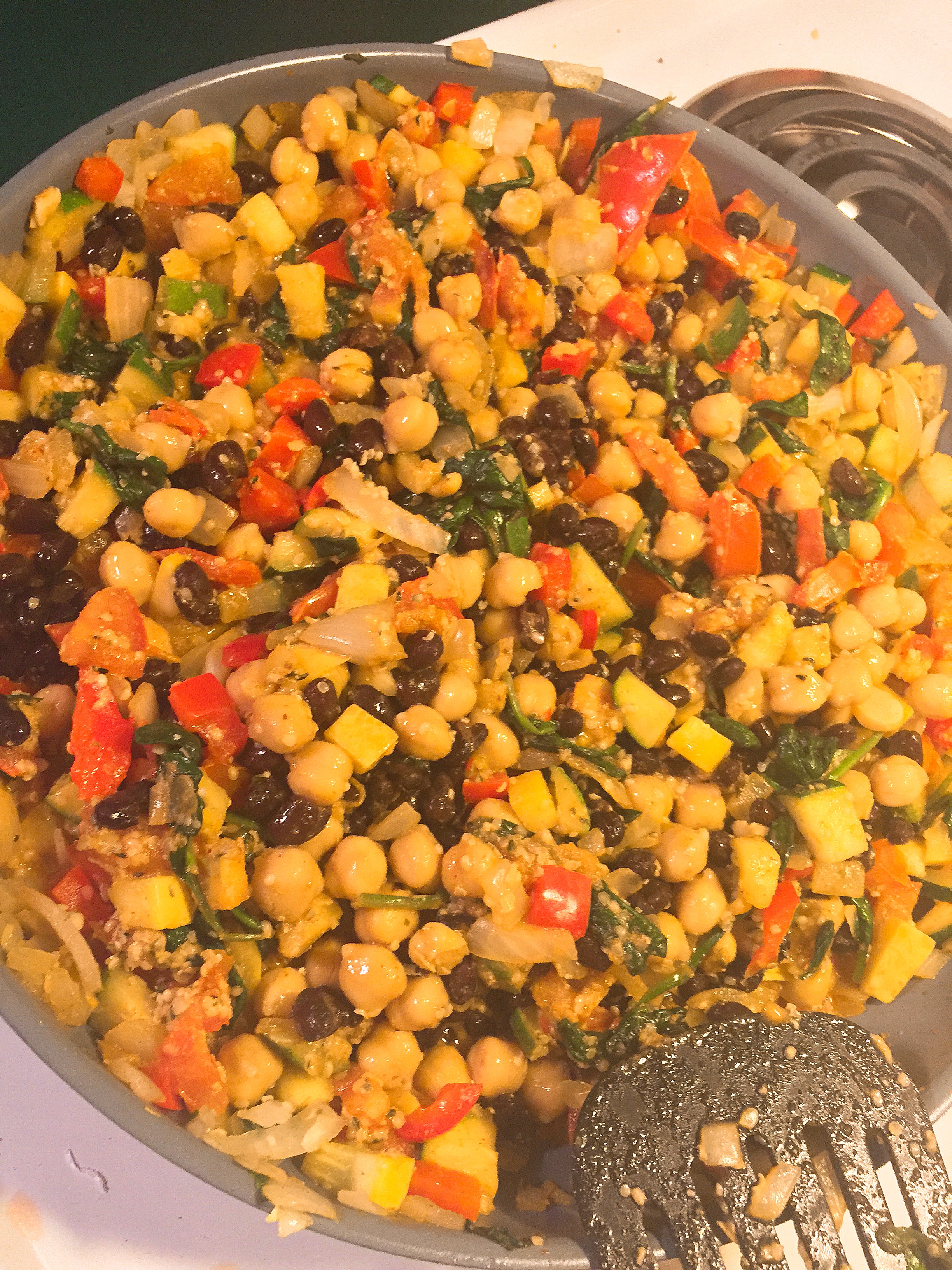 -When onions are tender, reduce heat and add cumin, paprika, tomatoes, nutritional yeast, hemp hearts, beans, and garlic. Add spinach in increments and stir into the mixture