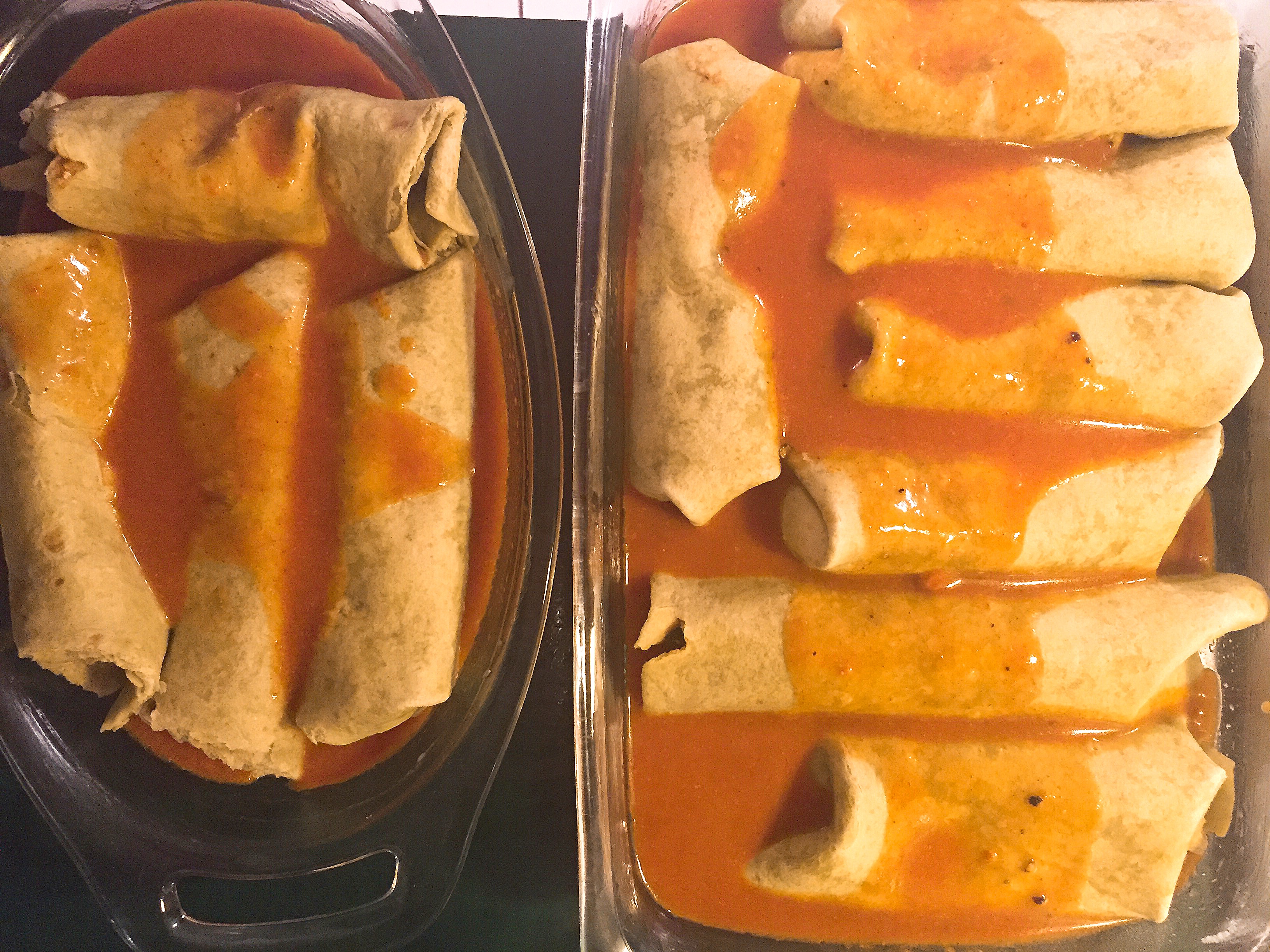 -Lightly coat the baking dish with coconut oil and cover the bottom with layer of enchilada sauce (below)