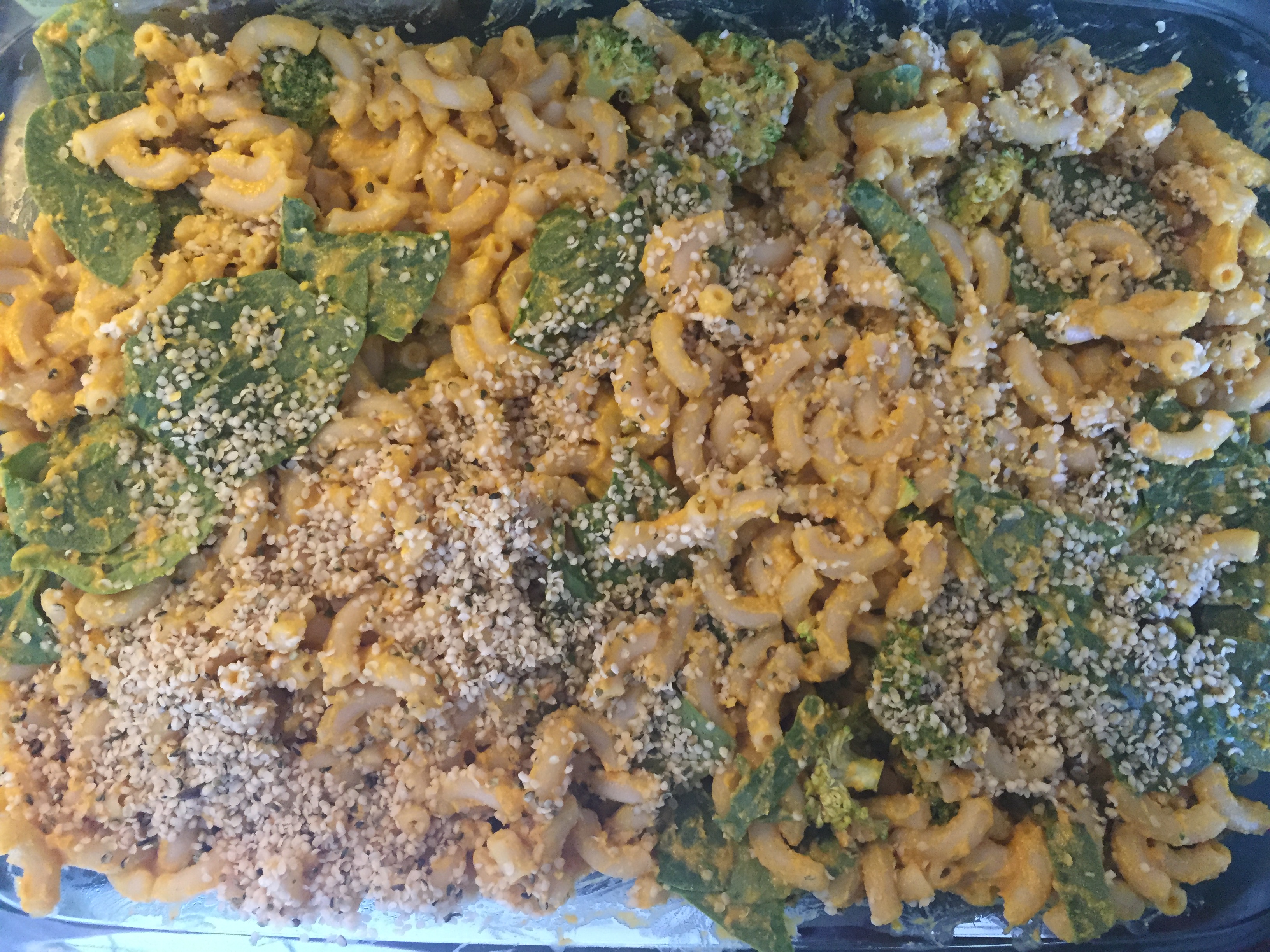 -Pour the cheese sauce over the pasta in the pot and turn the heat to medium just to warm it up. Mix until well combined. Add the spinach, broccoli, and the remaining half of the butternut squash and mix again. Sprinkle hemp hearts over the top and serve — the heat of the pasta mixture will soften the vegetables, but if you like your broccoli/spinach cooked more I would suggest sauteing them quickly before adding them to the pot
