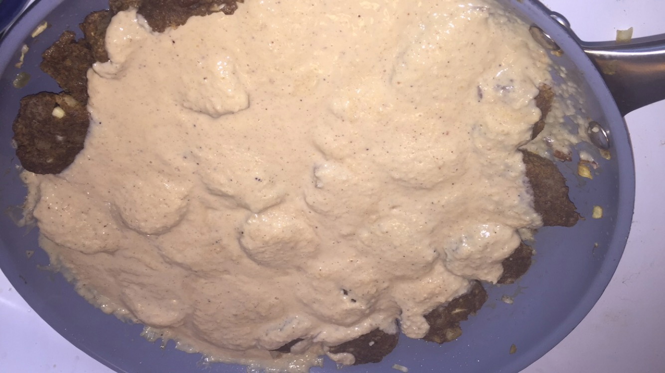 -To make the gravy, start off by cooking the garlic and onion in a medium sized pot for a few minutes until soft. Meanwhile, add all of the other ingredients in your food processor