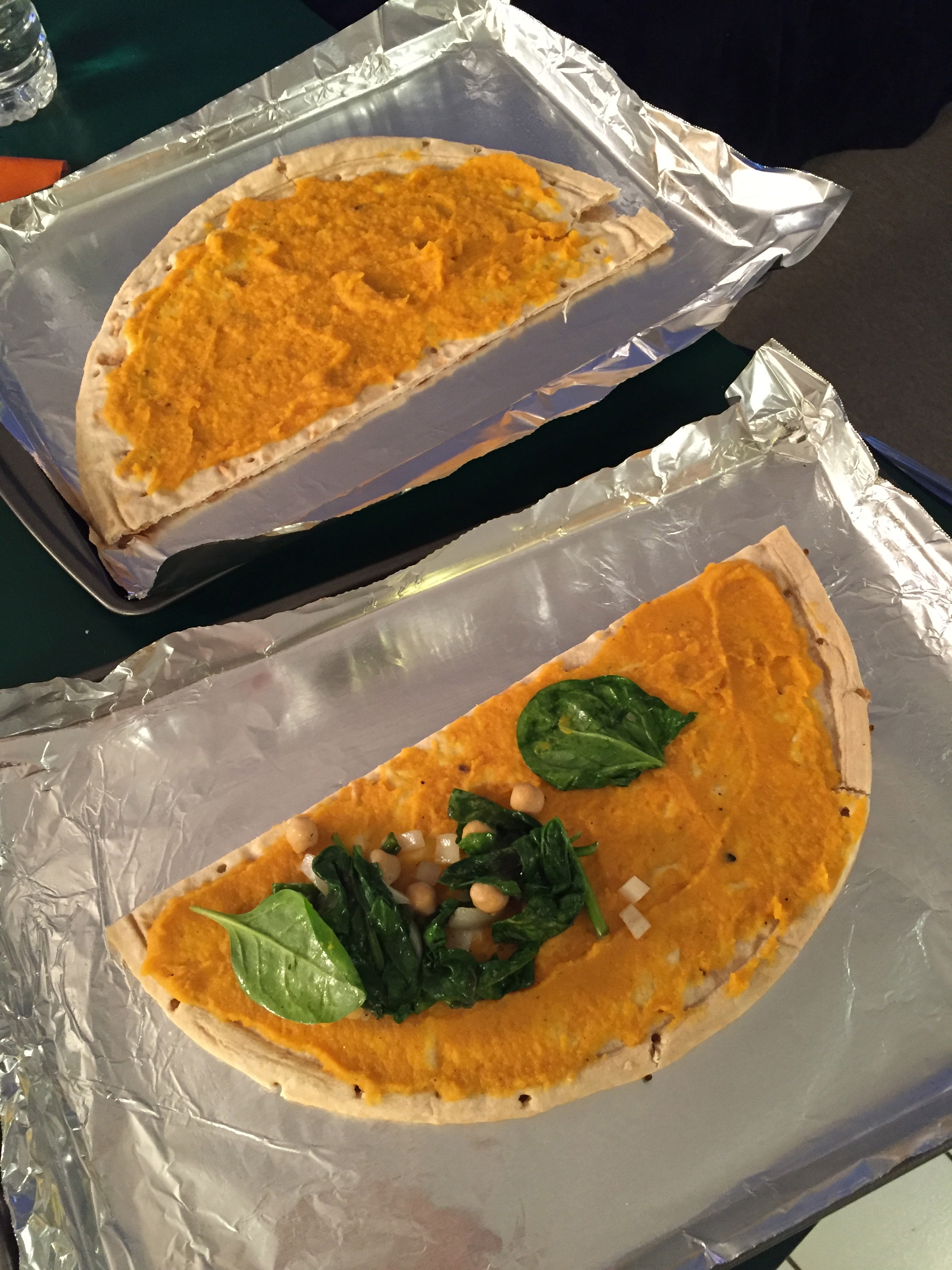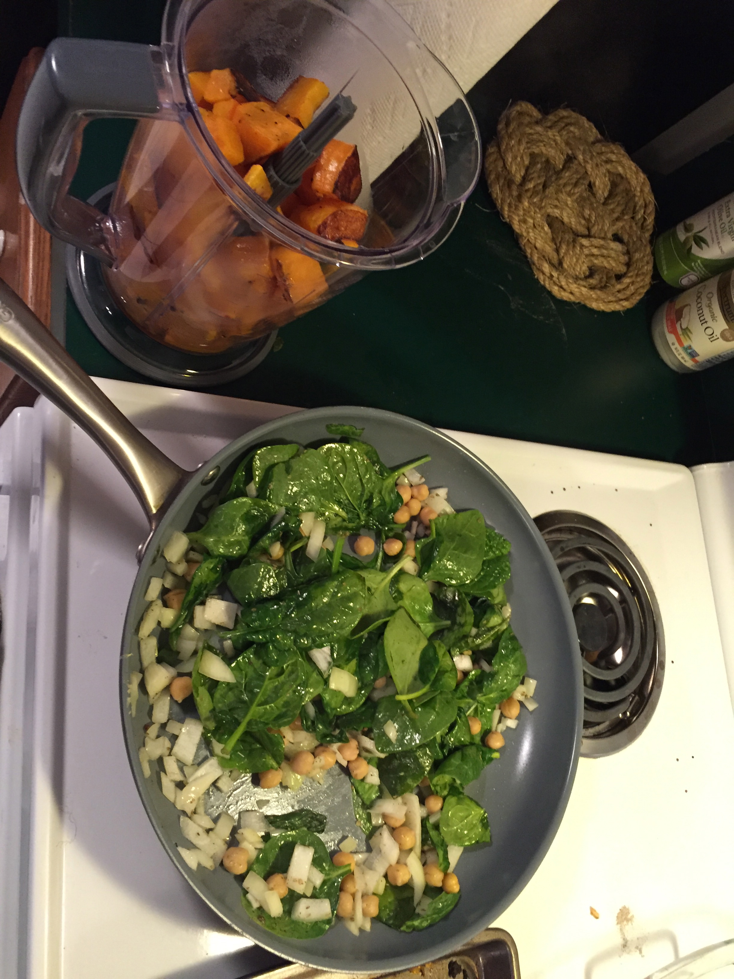 -Heat a large skillet over medium heat. Once hot, add 1 teaspoon oil, broccolini (or spinach), onion, chickpeas, salt and pepper, and oregano. Saute 2 – 3 minutes, stirring frequently. Set aside