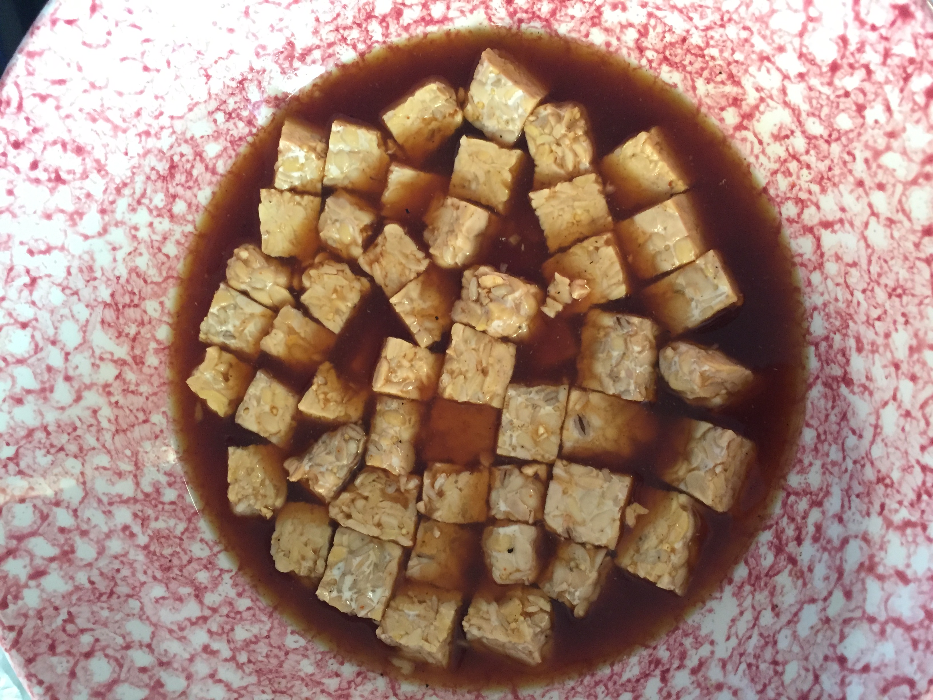 -Cut the tempeh into 20 – 24 small pieces, equal size, and place them in the sauce. Place that in the fridge to marinate for about 2 hours . . . feel free to marinate the tempeh even longer if you’d like. After you are done marinating, continue to the next steps