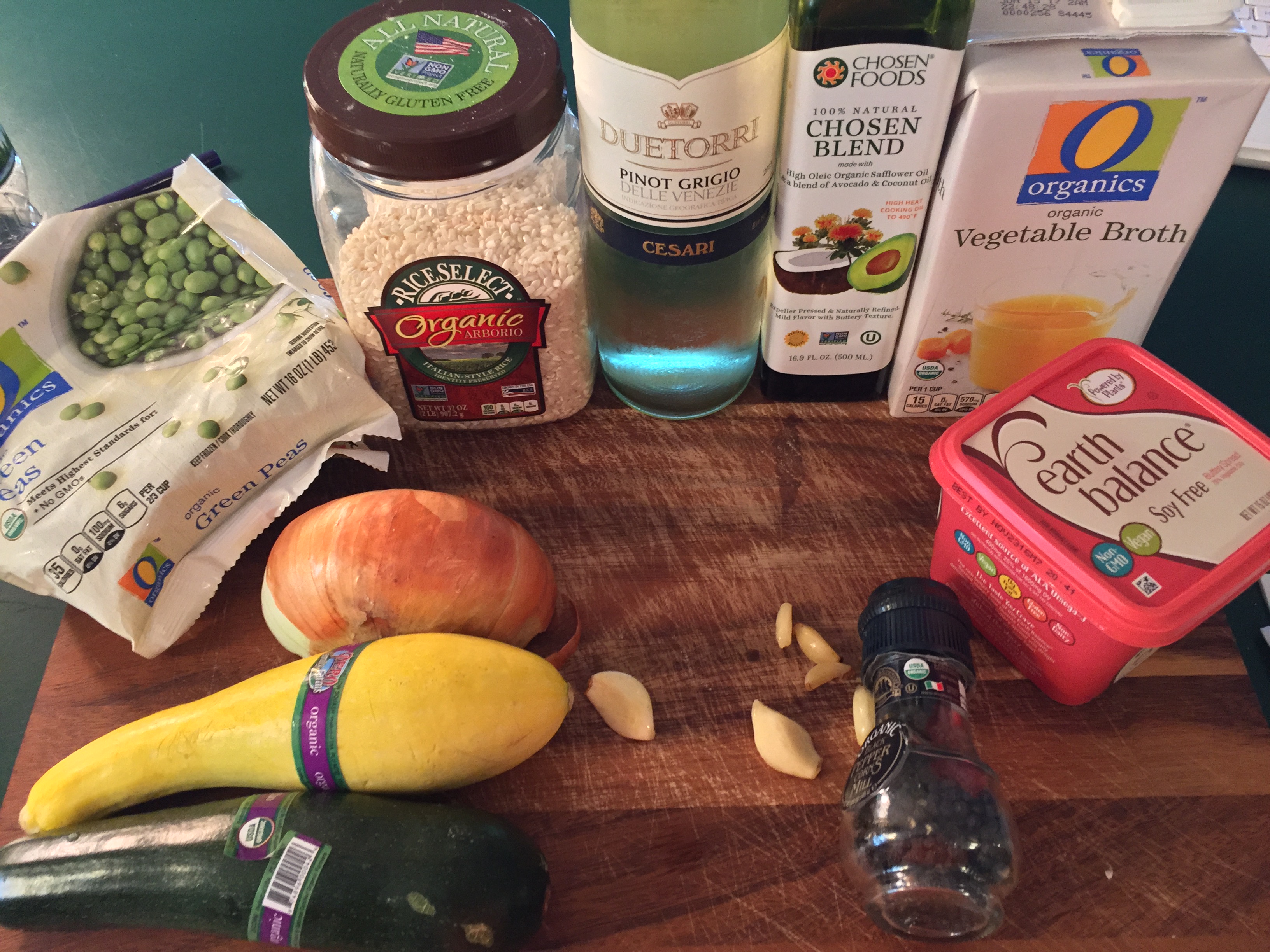 -After about 15 minutes add squash, zucchini, and peas. Continue stirring and adding broth until the vegetables are tender and the rice is al dente but looks creamy, about 5 minutes