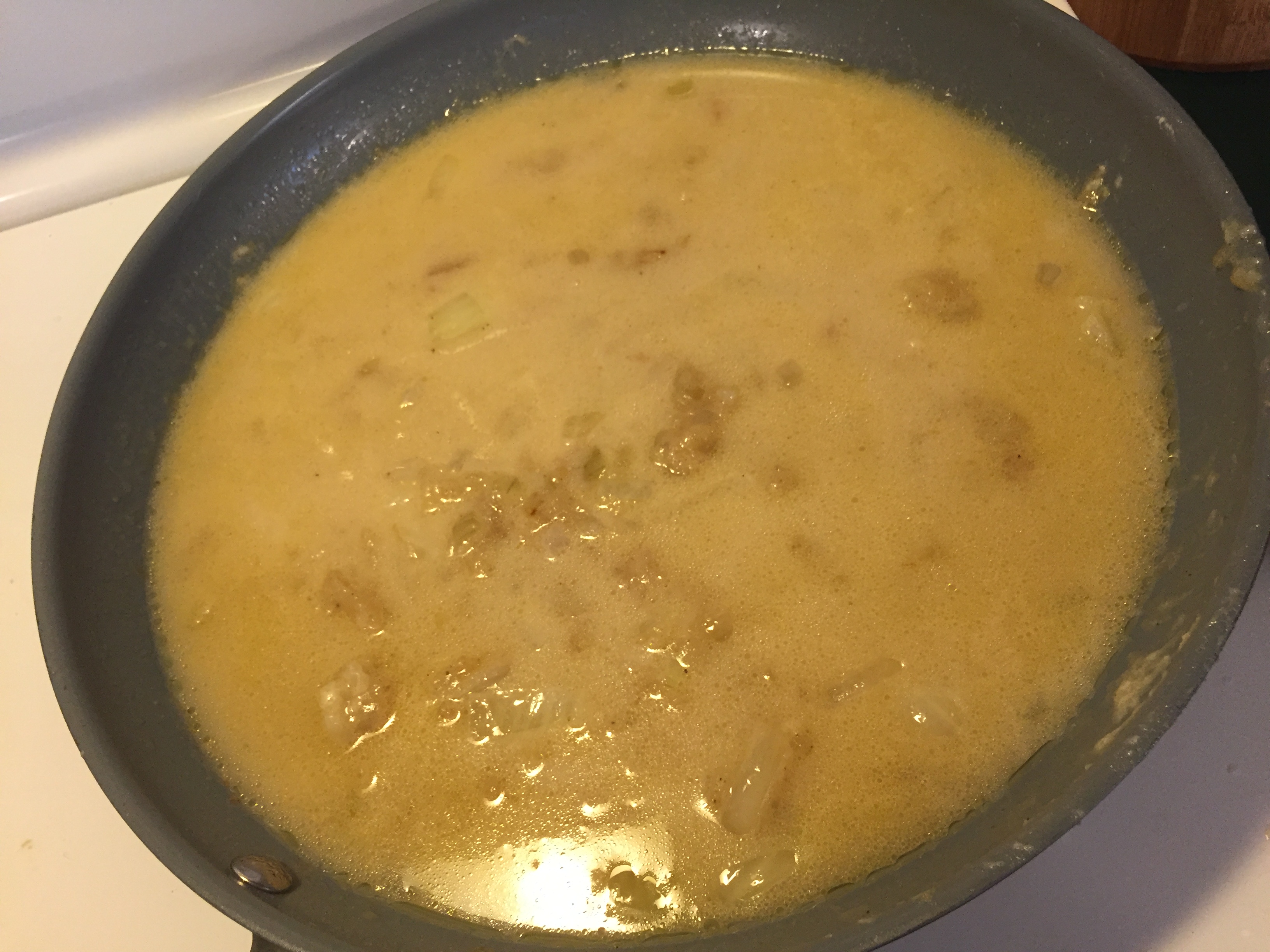 -Slowly stir in the broth and then add the milk. Reduce the heat to medium – low and simmer until thick, about 5 minutes. Remove from heat and stir in the drained vegetables