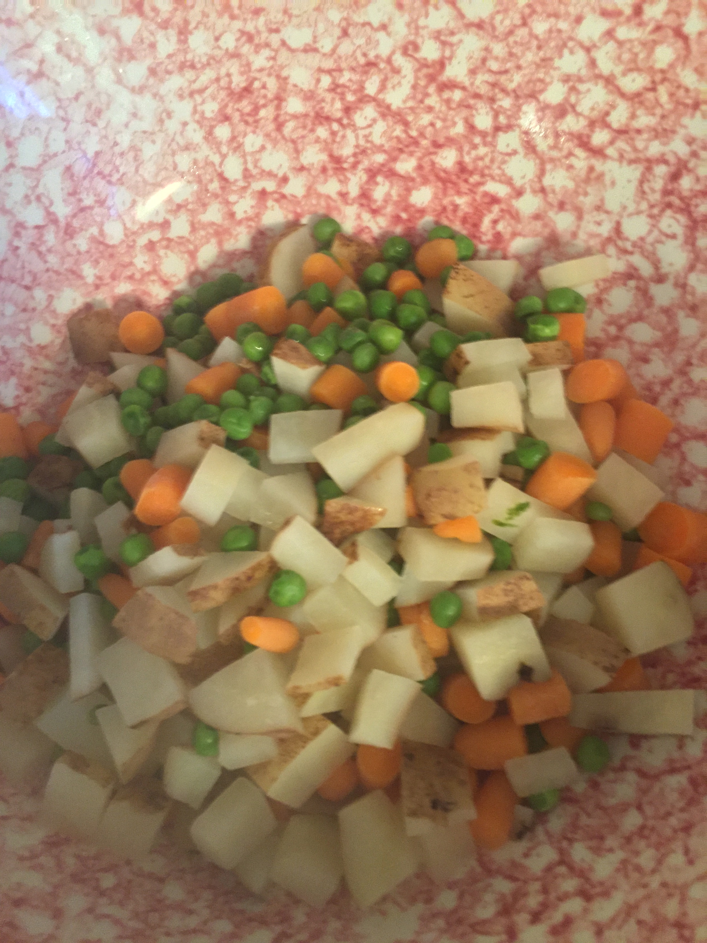 -In a medium saucepan combine the carrots, peas, potatoes, and celery. Cover with water, bring to a boil and cook until the potatoes are tender, about 15 minutes. Remove from heat, drain, and set aside