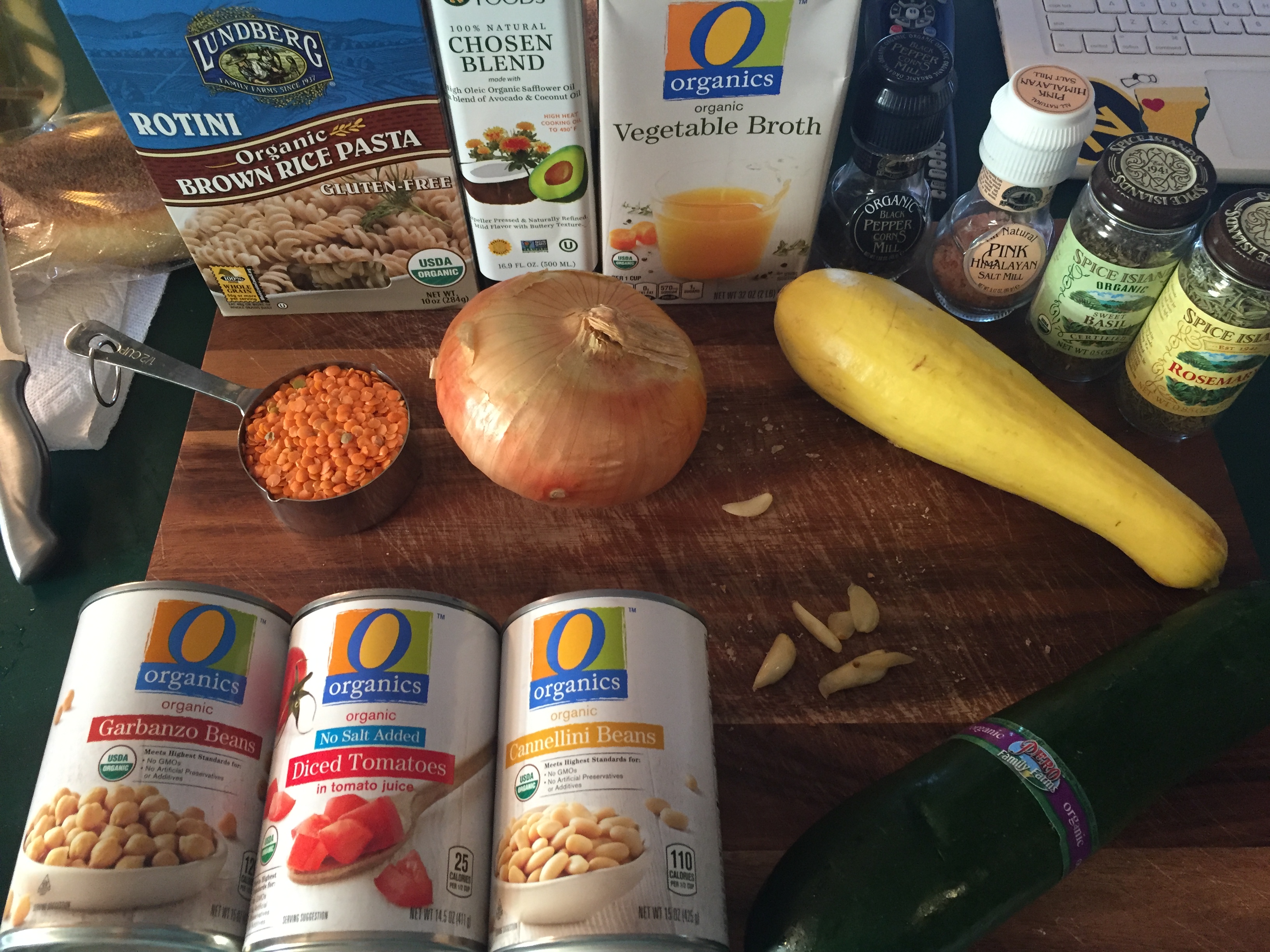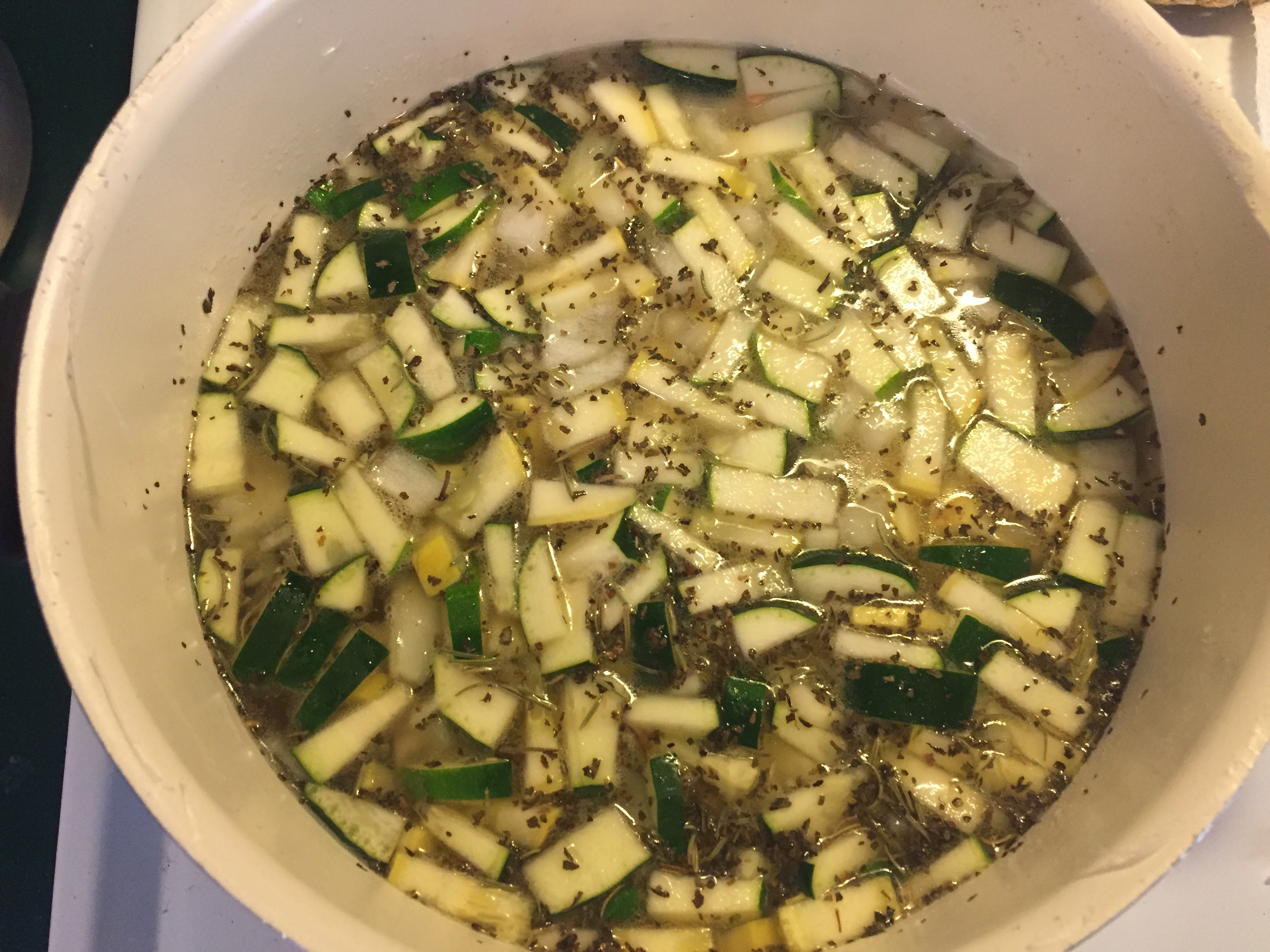 -Coat the bottom of a large pot with 1 Tablespoon oil and place over medium heat. When oil is hot add onion, zucchini, squash and cook until softened, about 5 minutes. Add garlic and cook 1 minute more. Add broth, lentils, rosemary, and basil. Raise heat and bring to a boil. Lower heat and allow to simmer until lentils are almost fully cooked but still a bit firm at their centers, about 20 minutes