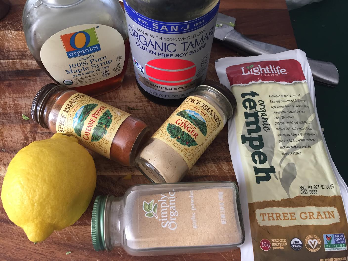 -In a large skillet, cook tempeh in equal parts water (4 oz tempeh = 1/2 Cup water). Add ginger powder, garlic powder, cayenne pepper, 1/2 teaspoon tamari, 1 teaspoon lemon juice, & 1 teaspoon maple syrup & cook covered on medium heat for 10 – 12 minutes until tempeh doubles in size & the water is completely absorbed