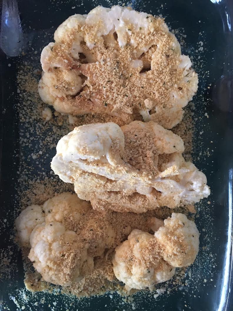 -Remove the leaves from the cauliflower. Vertically slice the cauliflower into 3/4″ steaks . . . you should get 3 – 4 slices. Place the cauliflower on baking dish, drizzle each side with a little oil. Sprinkle the ‘parmesan’ mixture onto both sides of each cauliflower steak